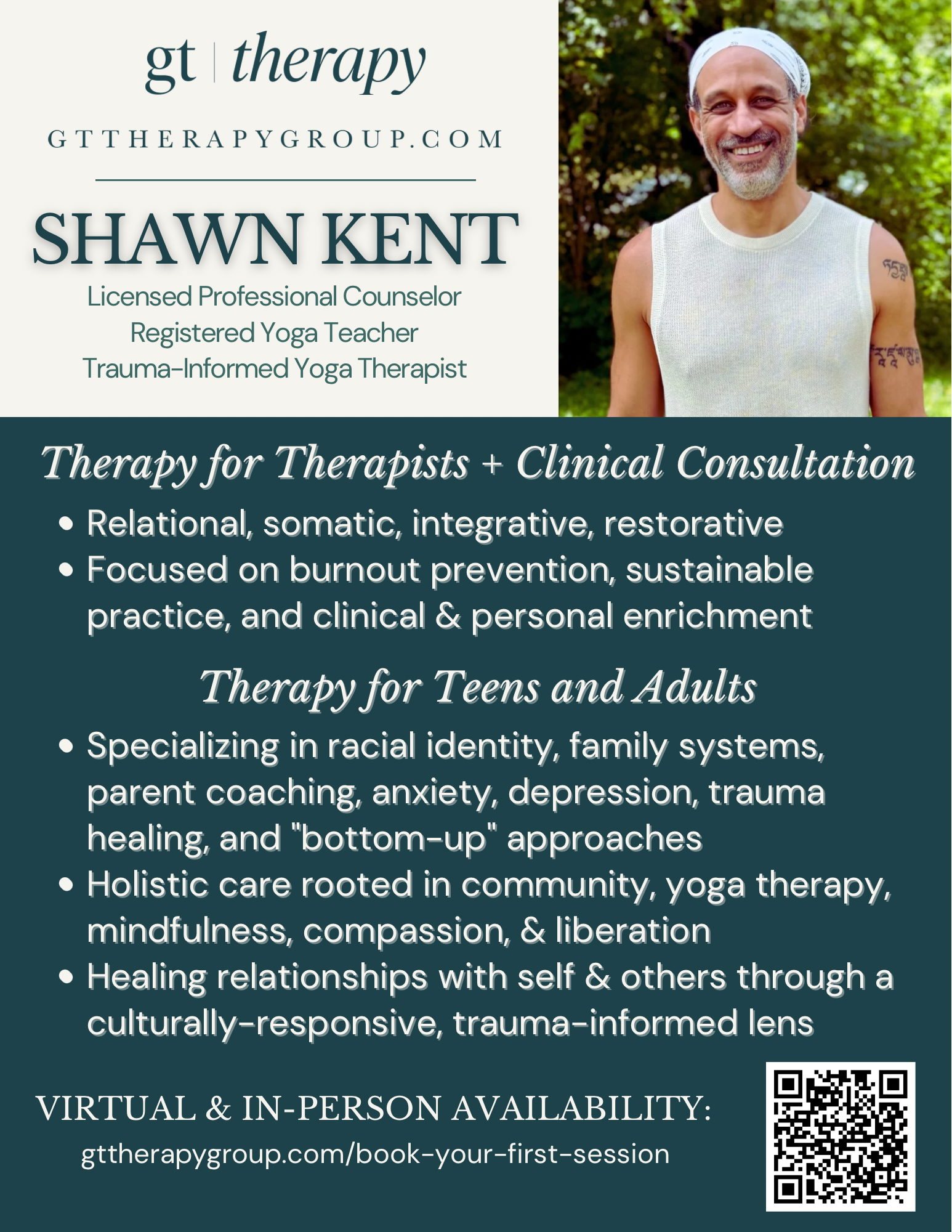 Many of you know Shawn Kent from his longtime work as a yoga teacher, instructor in trauma-informed yoga therapy, and his community healing work at Amala Foundation. Shawn has been in practice with us at GT Therapy since 2020, and has been a healer in our community for two decades. Shawn has recently expanded his practice to offer professional consultation and therapy for therapists that is rooted in his somatic, relational, bottom-up approach. If you’ve been looking for ways to reduce burnout, incorporate yoga practices, breathwork and body-based healing into your therapy practice or into your life, Shawn is a gifted teacher and therapist who brings his down-to-earth humor and deep knowledge into his work.